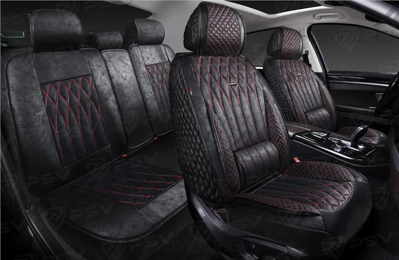 Накидки на весь салон 5D мокрая кожа PSV Titan Skin Черный/Отстрочка Красная