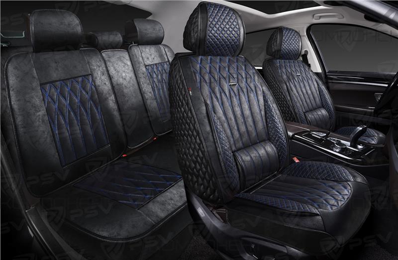 Накидки на весь салон 5D мокрая кожа PSV Titan Skin Черный/Отстрочка Синяя