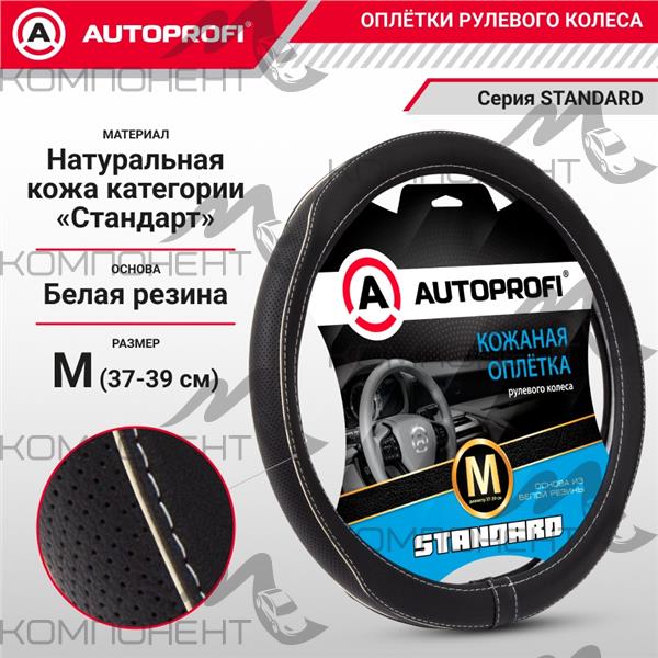 Оплетка руля M кожа нат. AUTOPROFI Standard перф. вставка, бейка, прострочка Черный/белый