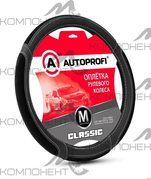 Оплетка руля M экокожа AUTOPROFI Classic вставки из замши на спонж. подложке, прострочка Черный/бел.