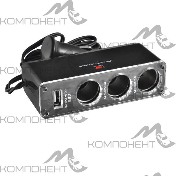 Разветвитель прикуривателя 3 гнезда + USB SKYWAY предохранитель 5А, USB 1A Черный