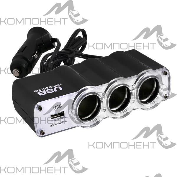 Разветвитель прикуривателя 3 гнезда + USB SKYWAY предохранитель 5А, USB 1A Черный