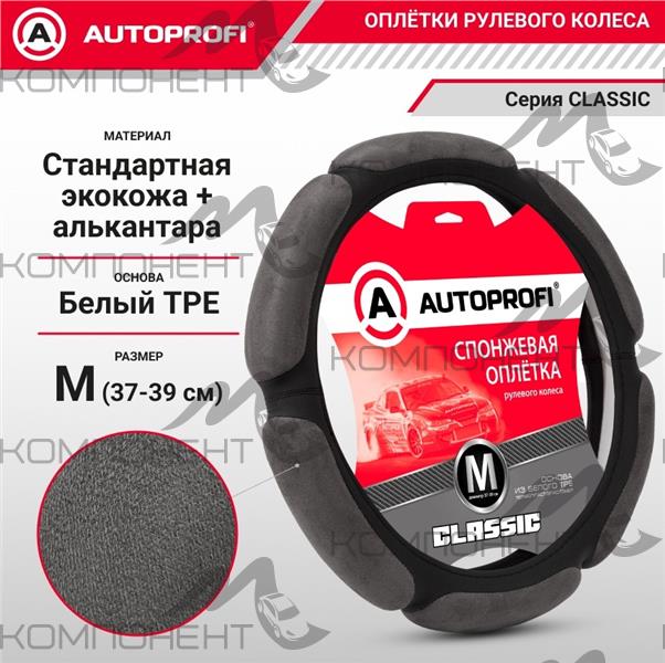 Оплетка руля M ( 6 подушек) экокожа+алькантара AUTOPROFI Classic наполнитель 2см Черная/темно-серая